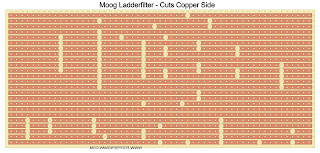There are 31 wirebridges to put in and that's why it takes up a lot of space dispite this being a project with very few components. However, I managed to keep the board to 41 holes width with room to spare so it will fit behind a Eurorack faceplate if necessary.